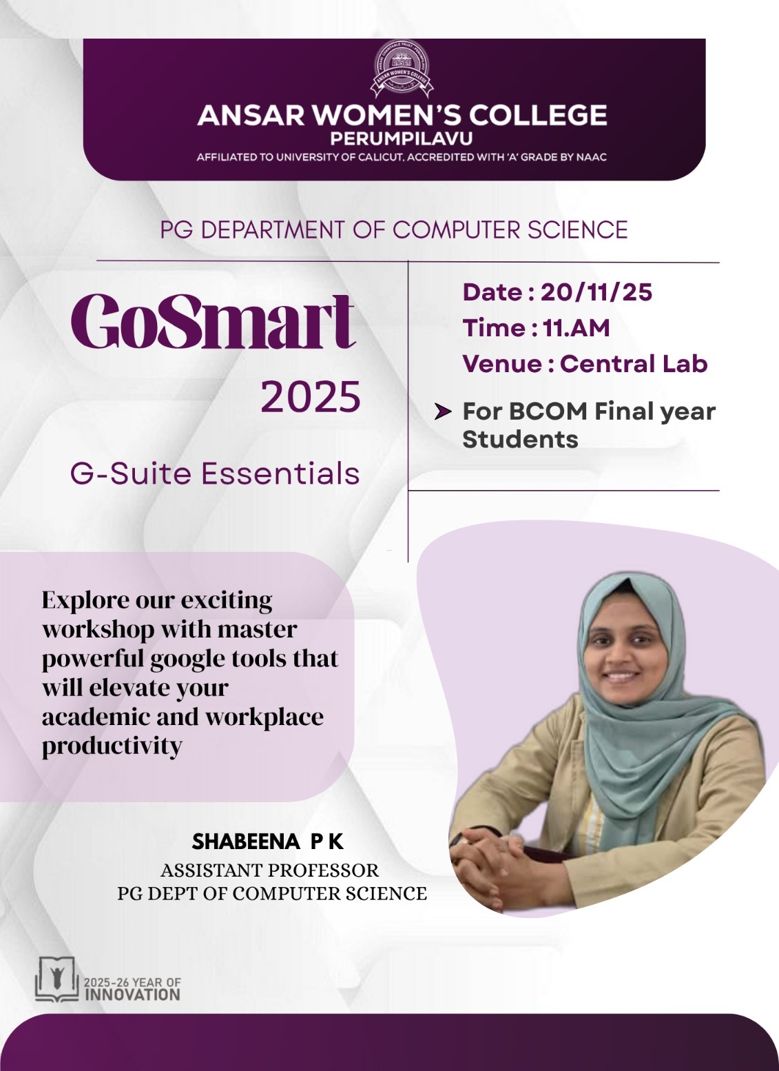The PG Department of Computer Science, Ansar Women’s College, Perumpilavu, successfully conducted the GoSmart 2025 – G-Suite Essentials Workshop for the B.Com final year students. The session was held on 20 November 2025 at 11:00 AM in the Central Lab.